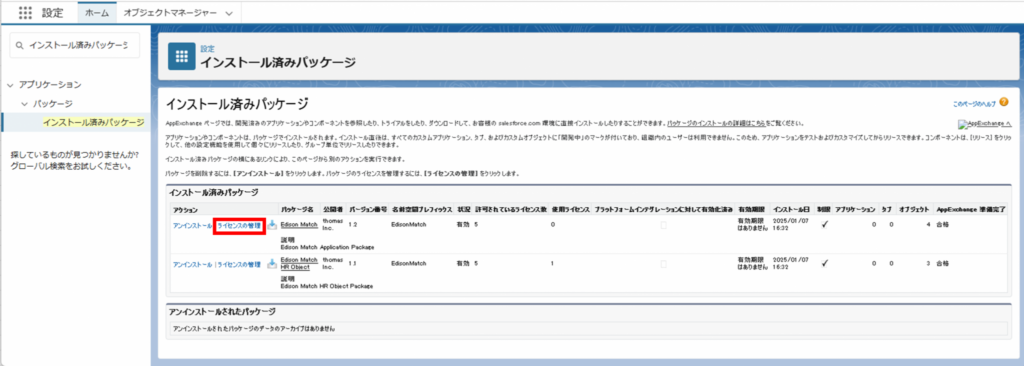 設定のクイック検索で「インストール済みパッケージ」と検索し、ライセンスを付与するパッケージの「ライセンスの管理」を押してください。