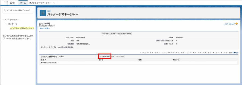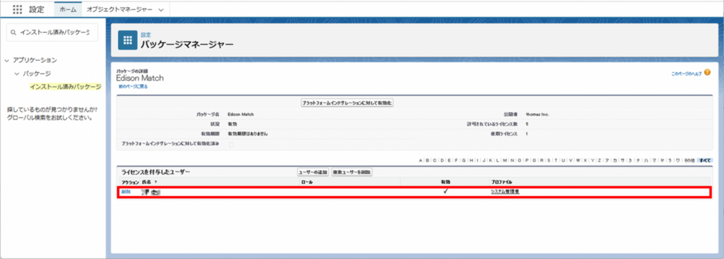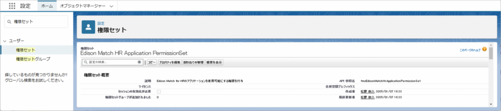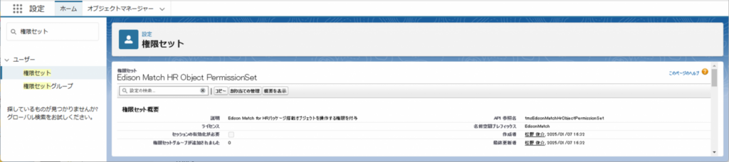 すでにインストールされている「Edison Match HR Application PermissionSet」を付与してください。