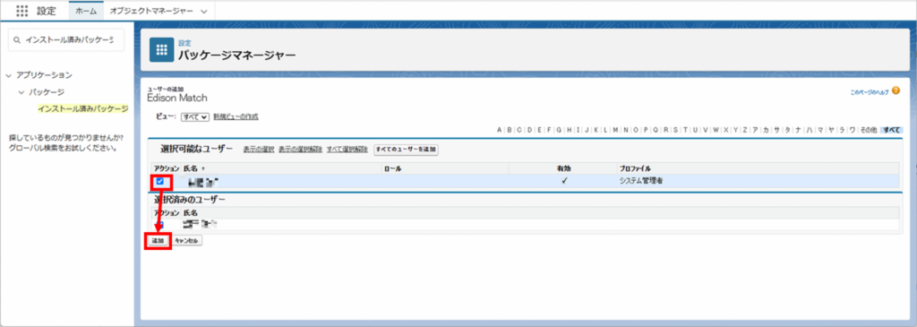 パッケージのライセンスを付与するユーザーにチェックをつけ、「追加」を押します。